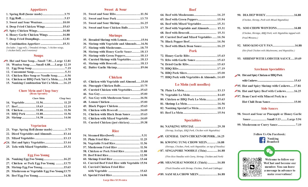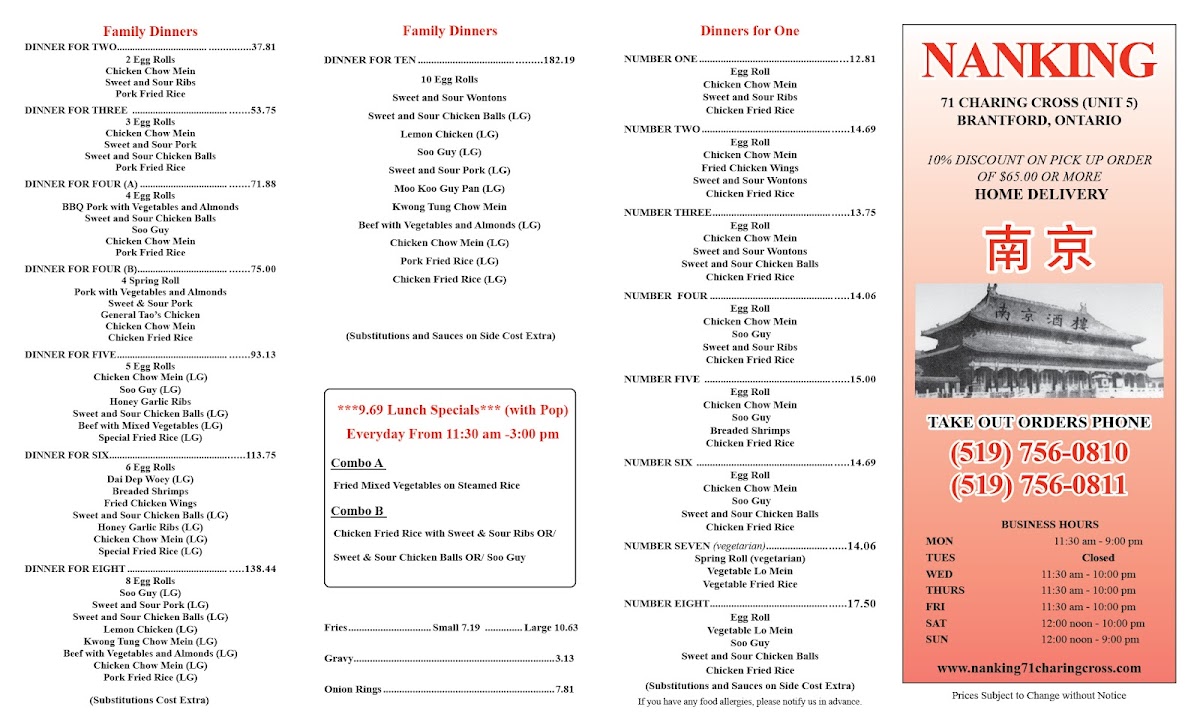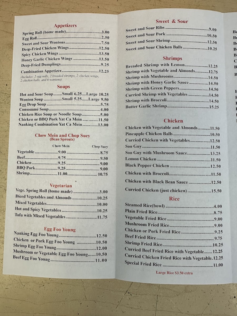 The menu at Nanking Restaurant offers a straightforward, comforting selection of classic Chinese dishes that work well for casual meals any time of day. Whether you're stopping by for a quick, satisfying lunch or gathering with family for a relaxed dinner, the variety of hearty options fits a laid-back, welcoming atmosphere.